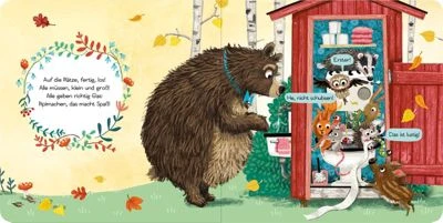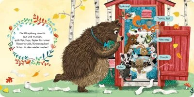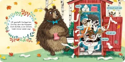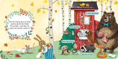 Wer pupst denn da? Nanu, was steht denn da im Wald für ein Häuschen? Da kommen ja lauter Pupse raus! Doch es ist nur der Bär, der auf dem neuen Klo sein Geschäft verrichtet. Nun wollen die anderen Tiere auch: Pipi machen, Klopapier von der Rolle abreißen und dann die Klospülung drücken. Händewaschen nicht vergessen! Was für ein Spaß!Mein lustiges KlosoundbuchDas Lieblingsthema der Kleinsten, verpackt in eine tierisch gereimte Geschichte, untermalt mit lustigen Sounds. Da macht das Sauberwerden gleich doppelt so viel Spaß. Egal ob Windelträger, Töpfchengeher oder Klokönig – hier lachen alle mit! – Wichtiger Entwicklungsschritt: Das Thema „Sauberwerden“ lustig erzählt in einer gereimten Geschichte- Mit Soundeffekt: 6 extraleicht auslösbare Sounds für kleine Kinderhände- Ton abschaltbar: Mit praktischem An- und Ausschalter auf der Buchrückseite- Batterien auswechselbar: Das Buch enthält handelsübliche Knopfzellenbatterien vom Typ LR 1130 mit je 1,5 V, die sich problemlos auswechseln lassen- Das Buch unterliegt strengen Sicherheitsanforderungen und regelmäßigen Qualitätskontrollen nach europäischer Spielzeugsicherheitsrichtlinie.