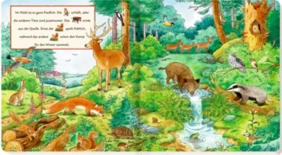 Der kleine Welpe tobt über die Wiese. Der Flamingo steht auf einem Bein. Das Eichhörnchen sammelt schon den Vorrat für den Winter. Aber was macht das Nashorn?Hier gibt es einiges zu entdecken! Ganzseitige Wimmelbilder und einfache Mitlesegeschichten laden schon die Kleinsten zum Suchen und Mitsprechen ein. Erkennen – benennen – immer wieder Anschauen!