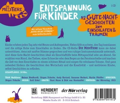 Ein Tag mit Schule, Sport und Spielen ist für viele Kinder aufregend. Da fällt es ihnen oft schwer, die nötige Ruhe zum Einschlafen zu finden. Die CD-Reihe »Die Meditiere« unterstützt sie dabei. Mit sanfter Stimme erzählt und von ruhiger Instrumentalmusik untermalt, sind die Geschichten ideal zur Entspannung am Mittag, aber auch als Einschlafhilfe am Abend. Sie machen die Zeit vor dem Einschlafen zu einem schönen Ritual und sorgen für erholsame Träume. Und ganz nebenbei fördern die Geschichten den Wortschatz und die Kreativität – und motivieren Kinder, selbst Geschichten zu erfinden.