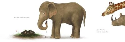Das Nilpferd sitzt in der Patsche. Bis zu den Ohren ist es in einem Schlammloch versunken! Der große, starke Elefant zieht und zieht, aber allein schafft er es nicht, das Nilpferd zu befreien. Alle Tiere helfen mit. Die großen, die mittelgroßen und die nicht ganz so großen. Aber erst, als die Kleinen mit anpacken, macht es endlich Platsch!, und das Nilpferd flutscht aus seinem Loch.
