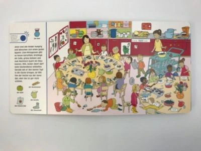 Mehr als 30 Sounds laden dazu ein, sich in den Kindergartenalltag zu vertiefen. Das Buch führt durch die verschiedenen Räume und lässt die kleinen Leser einerseits mit klassischen Suchvignetten und andererseits mit zusätzlichen Suchsounds das Geschehen hautnah erleben.