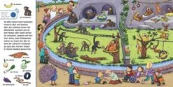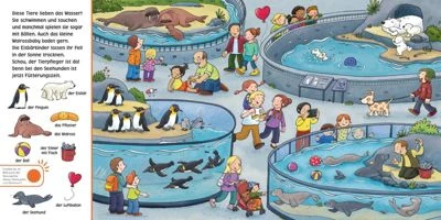 Das ist neu: Ein Wimmelbuch mit Geräuschen! 30 Sounds laden dazu ein, sich vollkommen in den Zoobesuch zu vertiefen. Das Buch führt durch den Park und lässt die kleinen Leser einerseits mit kleinen Bildern und andererseits mit von diesen unabhängigen menschlichen Stimmen, tierischen Lauten und Alltagsgeräuschen auf die Suche gehen und die Szenen genau beobachten und hautnah erleben. Da sind zum Beispiel kleine Vignetten wie der Rucksack, die Möhre, der Fischeimer, der Ball, das Eis, der Bollerwagen, der Pinguin, das Zebra, das Seepferdchen, der Schimpanse und die Ziege und schon machen sich die Leser auf die Suche, all dies in den großen Bildern zu entdecken. Und sobald sie auf den Sound-Knopf drücken, geht die Suche mit anderen Sinnen spannend weiter: Da hören sie beispielsweise, wie Mutter und Kind sich erstaunt über einen Zwiebel essenden Affen unterhalten. Aber wo im Bild sind genau diese Mama und dieses Kind, die da sprechen? Und woher kommt das Muhen, wenn doch keine Milchkuh im Afrikagehege zu finden ist? Und welches Tier antwortet dem Tierpfleger? Dieses Buch ist Wimmelbuch und erstes Hörspiel in einem. Es fördert Wahrnehmung und Konzentration und macht dabei auch noch Spaß!Typisch Hör mal: Jedes Buch der „Wimmelbuch“-Reihe enthält 6 leicht auslösbare Soundspuren mit insgesamt über 30 Einzelsounds und einer Gesamtspielzeit von etwa 220 Sekunden. Durch Druck auf die farbig markierten Punkte auf jeder Doppelseite werden die Geräusche aktiviert und deaktiviert. Kinder ab 2 Jahren können die Bücher problemlos alleine bedienen, bei jüngeren Kindern sollten die Eltern die Soundbuttons drücken, da die Feinmotorik und Kraft der kleinen Finger manchmal noch nicht ausreicht. Alle Titel der Reihe unterliegen strengen Sicherheitsanforderungen und Qualitätskontrollen. Jeder Soundknopf wird vor der Auslieferung auf seine Funktionsfähigkeit geprüft. Die Lautstärke der Sounds entspricht den Vorgaben der europäischen Spielzeugrichtlinie. Ausgeliefert werden die Bücher mit 3 handelsüblichen Knopfzell-Batterien LR 1130 mit je 1,5 V. Die Batterien lassen sich problemlos auswechseln. Dies ist zum Beispiel der Fall, wenn die Sounds nicht mehr die volle Spielzeit haben oder sich nur noch schwer auslösen lassen.Hofmann, JuliaJulia Hofmann liebte es stets sich Geschichten auszudenken und ihre Umwelt genau zu beobachten. Nach einem Studium der Erziehungswissenschaft und Germanistik machte sie diese Leidenschaft zum Zweitberuf. Die Kita-Leiterin und Mutter von Zwillingen lebt heute mit ihrer Familie und zwei Katzen in einem kleinen Dorf an der Nordsee.