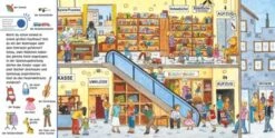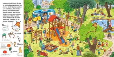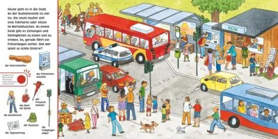 Mehr als 30 Sounds laden dazu ein, die Stadt zu erkunden. 6 Wimmelbilder rund um Straßenverkehr, Einkaufspassagen, Wochenmarkt, Stadtpark mit Spielplatz und vielem mehr werden mit Bildchen am Rand ergänzt, die zum gezielten Suchen und Finden einladen. Ein Druckknopf auf jeder Seite löst zudem eine Reihe von aufeinanderfolgenden verschiedenen Geräuschen und kurzen Redesequenzen aus, deren Verursacher ebenfalls in den großen Wimmelbildern gesucht werden können.