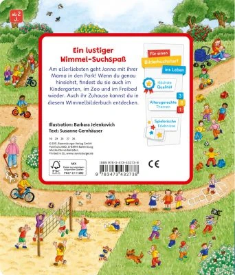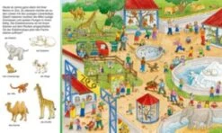 Elf Wimmelbilder aus der Alltagswelt des Kleinkindes laden zum genauen Hinsehen ein. Kleine Suchbilder fordern zum Wiederfinden auf: Zuhause, im Kindergarten, im Park, beim Einkaufen auf dem Markt und im Kaufhaus, im Schwimmbad, Zoo uvm.