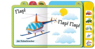 <p><strong>Hingeschaut und mitgehört!</strong></p> <p>- Mit 5 Sounds auf hochwertiger Soundleiste<br> – Spielerischer Lerneffekt: Fahrzeuge wiedererkennen und Geräusche erklingen lassen!<br> – Stabiles Pappebuch für kleine Kinderhände<br> – Liebevoll und altersgerecht illustriert</p> <p>Wie macht das Auto? Genau, hup huup! Ring ring – da kommt das Fahrrad um die Ecke. Mit Spaß und Neugier entdecken Kleinkinder ab 18 Monaten auf jeder Seite ein farbenfrohes Bild und bringen mit den passenden Geräuschen das Bilderbuch zum Klingen. Komplett aus stabiler Pappe und mit praktischen Daumenregistern zum einfachen Umblättern der Seiten!</p>