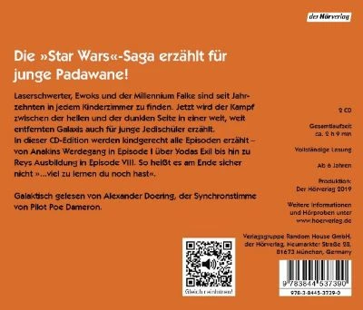 Die Star Wars-Saga erzählt für junge Padawane!Laserschwerter, Ewoks und der Millenium Falke sind seit Jahrzehnten in jedem Kinderzimmer zu finden. Jetzt wird der Kampf zwischen der hellen und der dunklen Seite in einer weit, weit entfernten Galaxis auch für junge Jedischüler erzählt.In dieser CD-Edition werden kindgerecht alle Episoden erzählt – von Anakins Werdegang in Episode 1 über Yodas Exil bis hin zu Reys Ausbildung in Episode 8. So heißt es am Ende sicher nicht „…viel zu lernen du noch hast“.Kasprzak, AndreasAndreas Kasprzak, Jahrgang 1972, arbeitet seit dem Abschluss seiner Buchhändlerlehre als Autor, Übersetzer, Herausgeber, Redakteur, Producer und freier Journalist für eine Vielzahl internationaler Buch-, Zeitungs- und Medienverlage. Neben diversen Romanen, Erzählungen und Novellen aus den Genres Thriller, Horror, Historischer Krimi, Fantasy und Science-Fiction stammen diverse Dreh- und Synchronbücher sowie eine Handvoll Kochbücher aus seiner Feder. Am Bekanntesten ist Kasprzak aber wohl als deutscher Stammübersetzer weltbekannter Franchises wie u. a. „Star Wars“, „Warcraft“, „Minecraft“ und „Assassin s Creed“. Zu den Künstlern, die er bislang mit viel Lob seitens Leser und Presse ins Deutsche übertragen hat, gehören u. a. internationale Bestsellerautoren wie George R. R. Martin, Patrick Rothfuss, Ursula K. LeGuin, H. P. Lovecraft, Joe Lansdale, Gillian Flynn, Timothy Zahn und Christie Golden. Zusammen mit seiner Familie und lebensgroßen Abbildern von Batman, Kung-Fu Panda, Rayman, Sam Fisher und Thrall dem Orc lebt Andreas Kasprzak mitten im Wiehengebirge, unweit von Bielefeld, das es allen Unkenrufen zum Trotz doch gibt.Doering, AlexanderAlexander Doering, geboren 1974, ist ein deutscher Synchronsprecher und Schauspieler. Er wurde als Stimme von Hobbit Merry Brandybock in der »Herr der Ringe«-Filmtrilogie bekannt und synchronisiert seit 2015 Poe Dameron in den »Star Wars«-Filmen.